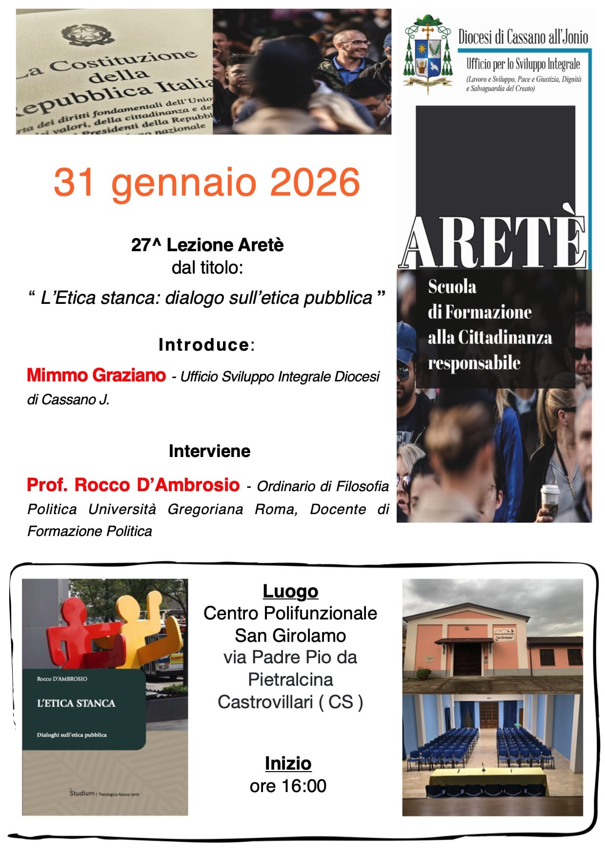 L'evento, introdotto da Mimmo Graziano, prevede l'intervento del professore Rocco D'Ambrosio, ordinario di Filosofia Politica dell'Università Gregoriana di Roma, docente di Formazione Politica, presidente dell'associazione Cercasi un Fine per progetti di Servizio Civile Universale in Italia e autore del libro "L'etica stanca. Dialoghi sull'etica pubblica".